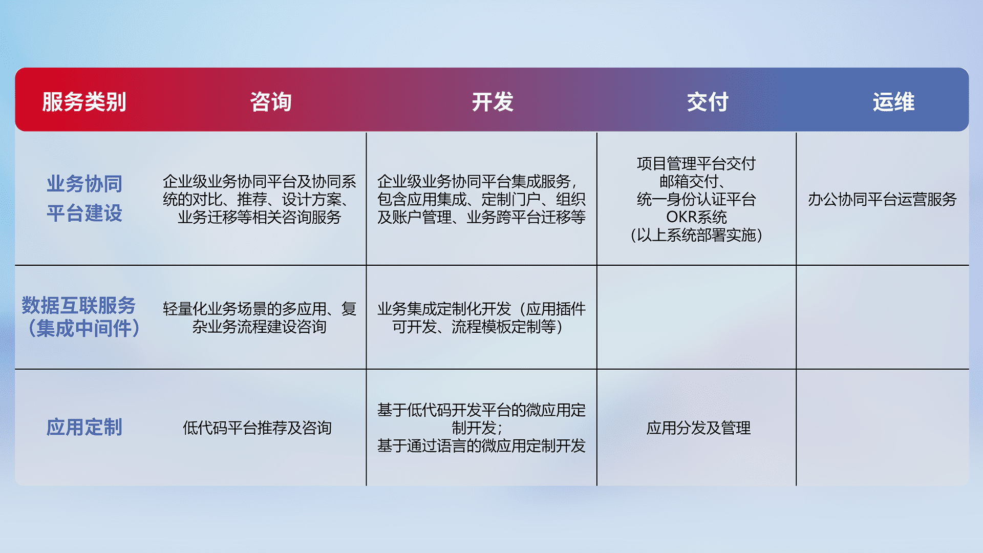 针对钉钉、、企微、、、IDaas等平台级产品提供产品的规划、、、方案、、交付、、、定制化开发等服务,,实现如统一协同办公、、、、智能客户服务、、、、混合会议管理、、智能数据查询、、等业务场景,,,,实现数字化转型。。。。